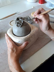le modelage de la terre glaise : dans la masse, le colombin, la plaque. Décoration et finition avant biscuitage par impression, gravure, engobes. Émaillage et seconde cuisson.